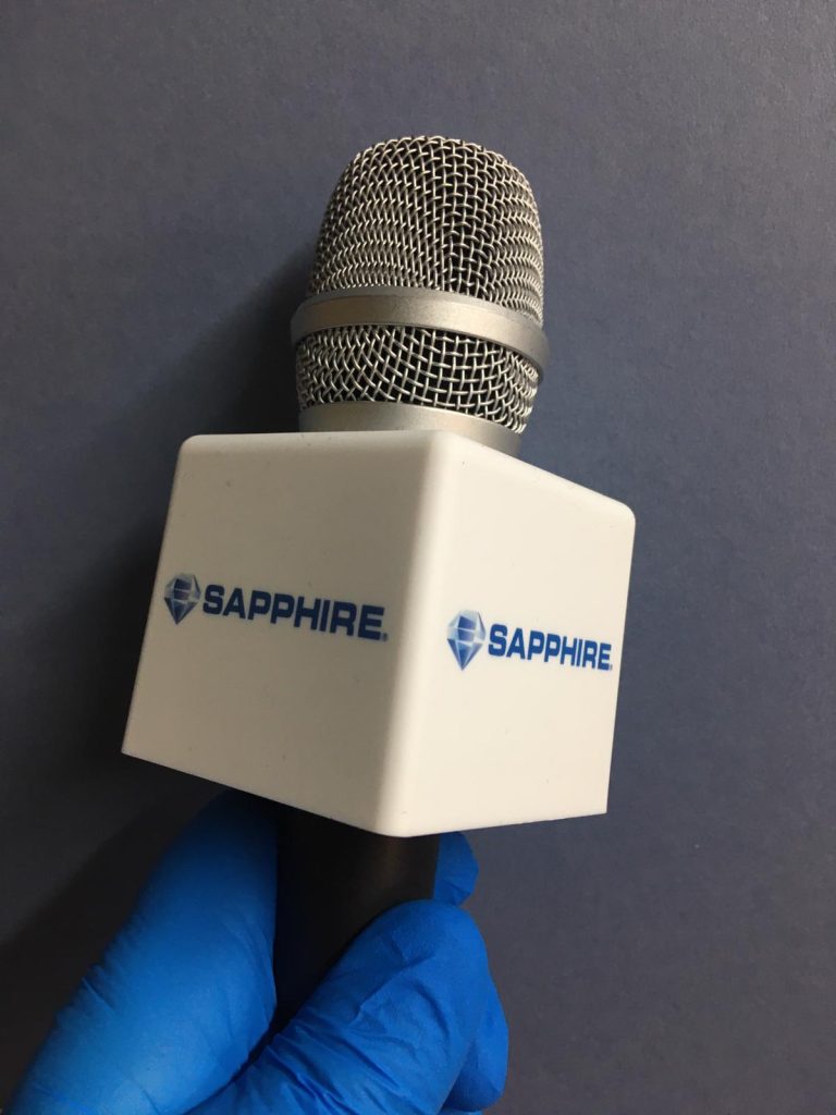If you ask us to cover an event, we’ll always suggest using one or more of our custom branded cube microphones within shot while you or your presenter are talking to the camera.